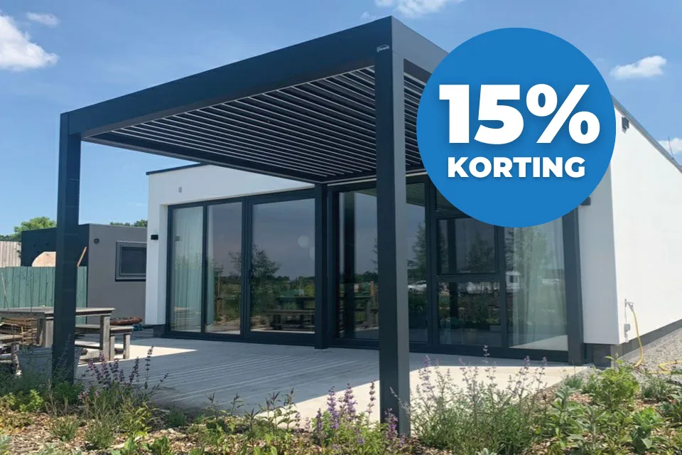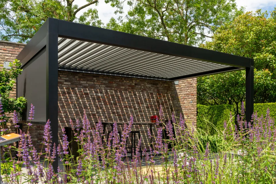 Het lamellendak is eenvoudig te bedienen met een handzender en beschikt over een fluisterstille motor. Je kunt ervoor kiezen om de lamellen open te zetten of om te sluiten. Wanneer de lamellen gesloten zijn zit je heerlijk overdekt buiten. Dit model heeft als voordeel dat het een spatwaterdichte afwerking heeft en je ook bij slecht weer heerlijk droog kunt zitten. Wil je extra ventilatie op je terras? Je kunt de stand van de lamellen veranderen voor extra doorluchting. Deze terrasoverkapping ziet er robuust en degelijk uit door de aluminium afwerking voor een moderne uitstraling van je terras.