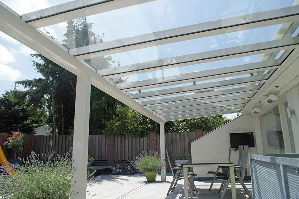 De Verano Riva V920 is een luxe terrasoverkapping van aluminium met een dak van 55.2 veiligheidsglas. Dankzij het glazen dak behoud je het licht van buiten maar geniet je wel van beschutting bij slechter weer. Het glas ligt onderin de liggers en wordt aan de bovenzijde vastgezet door middel van glaslatten. Het frame van hoogwaardig aluminium voldoet aan de Europese norm voor dragende constructiedelen. De Verano Riva is tot maximaal 14 meter te verkrijgen.