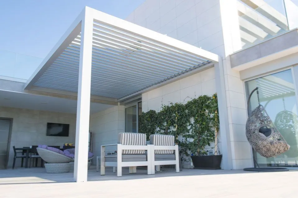 De lamellen overkapping is een echte eyecatcher voor je terras met het kubistische design. De Zon en Scherm Wetar is gemaakt van duurzaam aluminium en zonder meerprijs leverbaar in alle RAL-kleuren, zowel structuur als glans! Als extra optie kan je de overkapping afdichten met glaswanden of een screens voor extra comfort. Vanzelfsprekend is de Wetar eindeloos te koppelen.