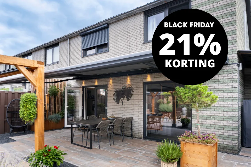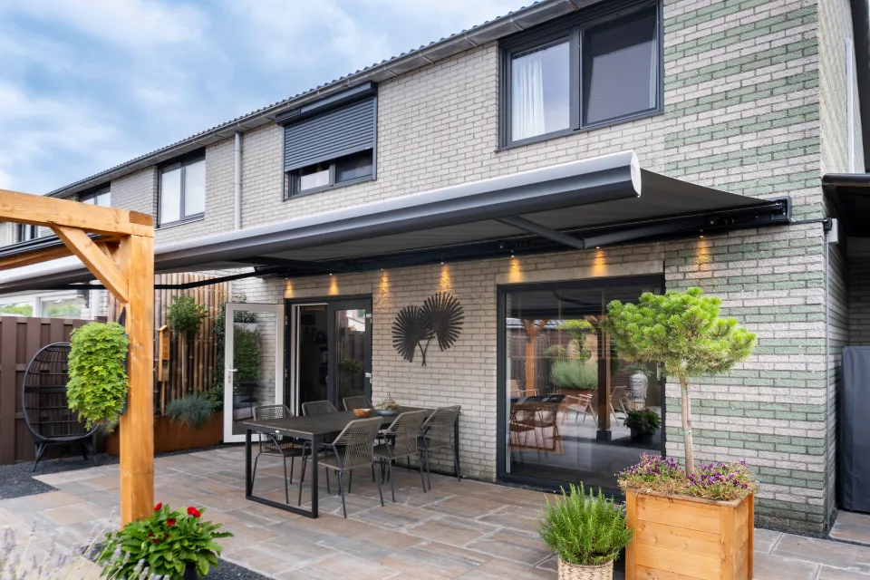 Het zonnescherm wordt volledig op maat gemaakt naar jouw terras en wensen. Standaard is het scherm verkrijgbaar in vier systeemkleuren en een handmatige bediening. Wij raden aan het om tegen een geringe meerprijs dit te upgraden naar een elektrische (draadloze) bediening. Daarnaast kan je kiezen uit maar liefst 400 zonneschermdoeken en aanvullende opties als: LED-verlichting, Somfy TaHoma Box, windautomaat en een zonnecel.
